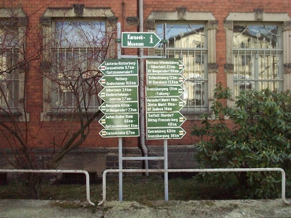 Wegweiser gegenüber des Bahnhofes - neben Telefonzelle Post.